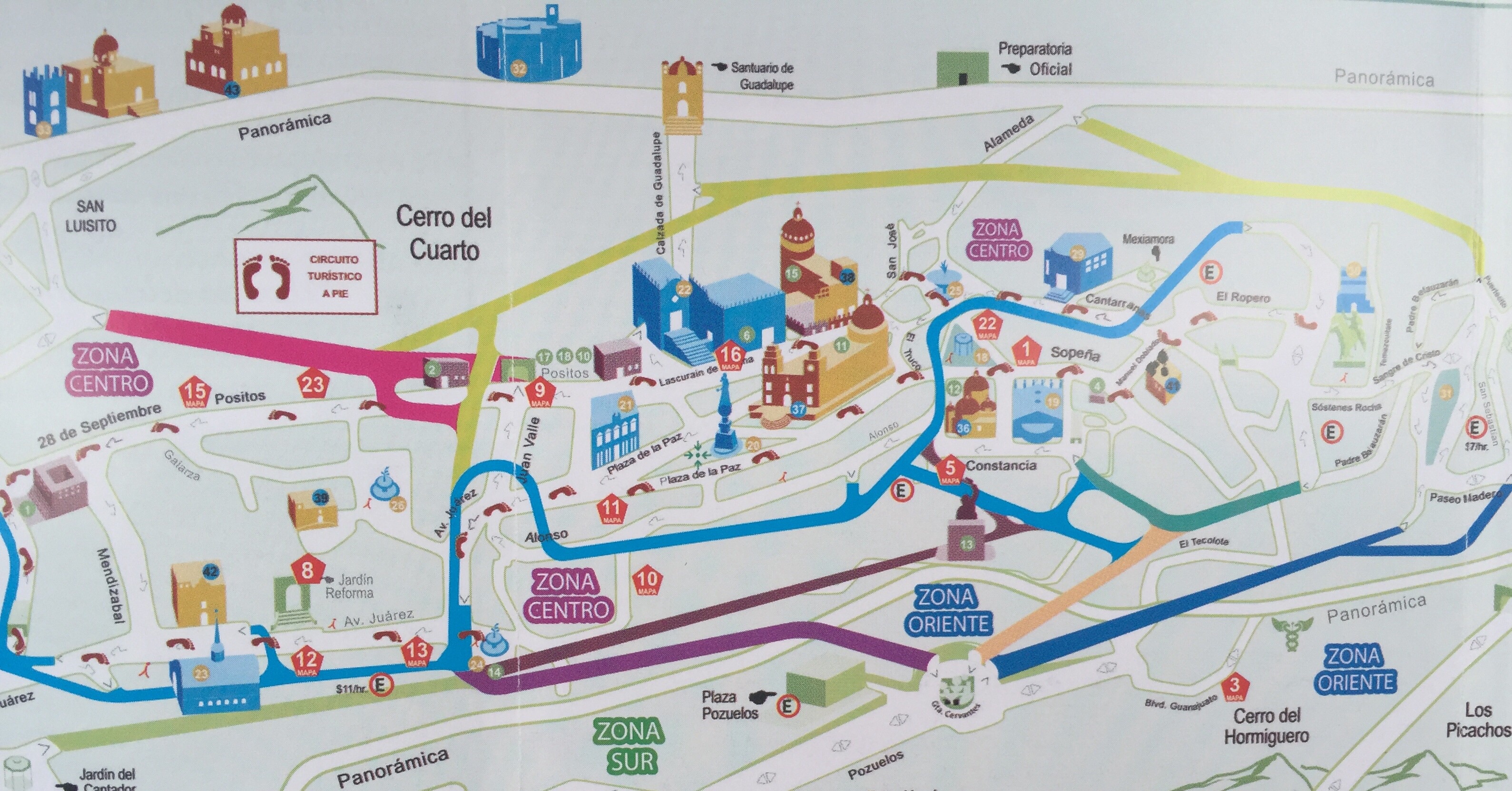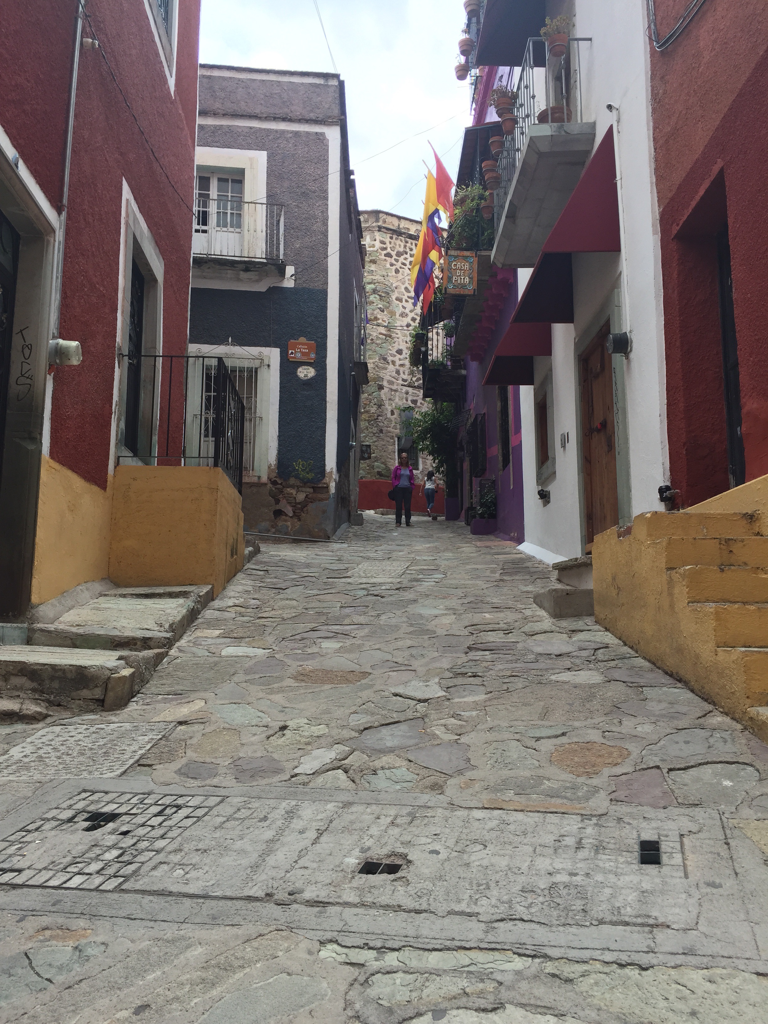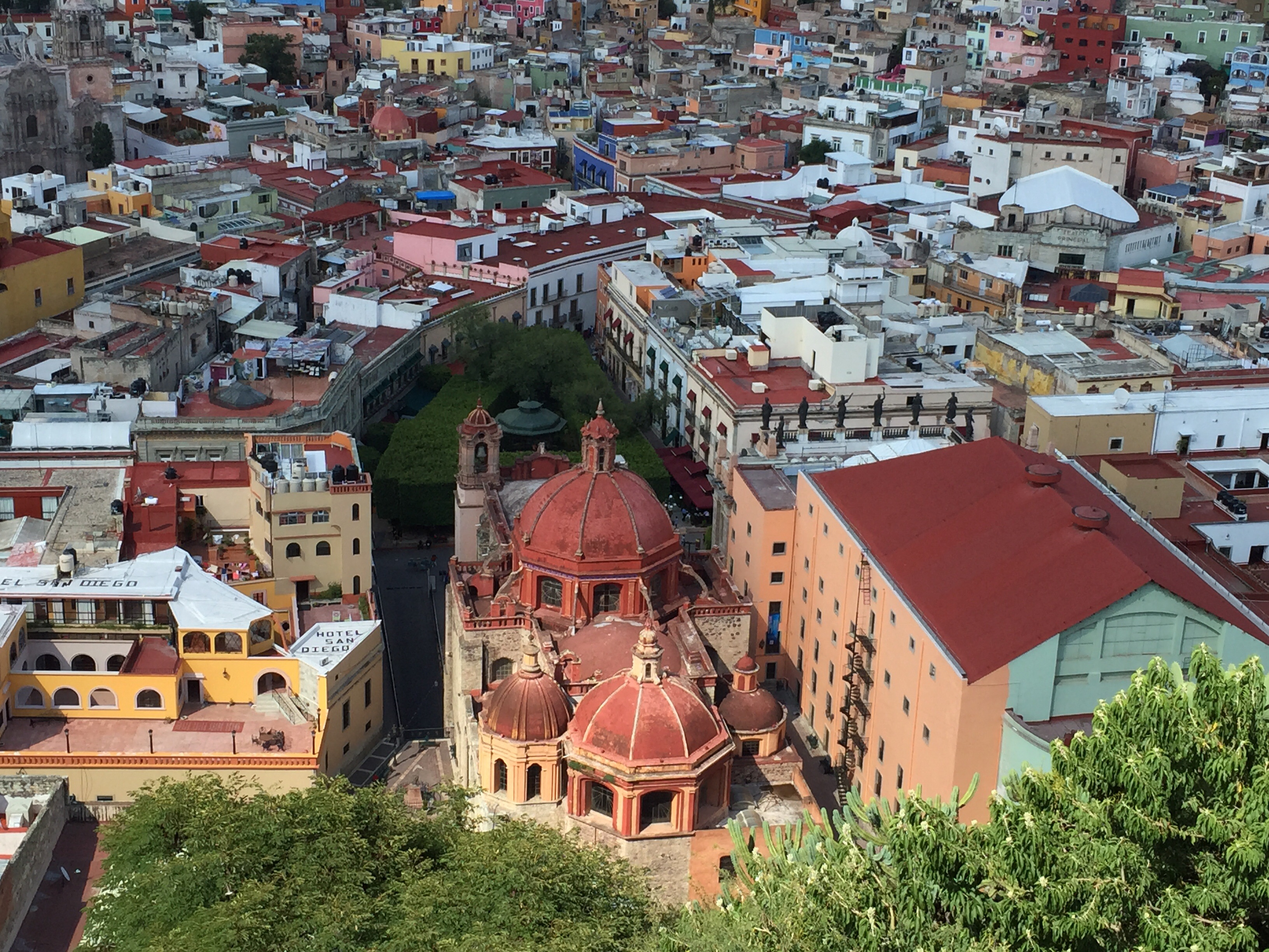 imageOur first view of Guanajuato from the rooftop terrace of our hostel took our breath away. The tightly packed city with its beautifully colored buildings is very picturesque. This colonial era city (founded in 1570) is accurately described as “human” oriented. Yet, it’s many one-lane, one-way streets are packed with vehicles (buses, taxis, delivery trucks and personal autos). The narrow valley in which it is located makes its streets narrow and winding. Most are imagealleys that cars cannot pass through, and some are long sets of stairs up the mountainsides. The people who live there (and people who stay in hostels there) park or get off the bus in central areas and then walk up the narrow alleyways.  Our poor flatlander legs were exhausted by the amount on climbing involved in getting anywhere. On the first day we went for a walk and soon found ourselves lost in the narrow streets.image A kind lady helped us just as were starting through a tunnel (in completely the wrong direction) and pointed us in the right direction. We were only a few blocks from home.  Much of the city are narrow streets and two or three-story buildings but then you come around a corner and there are lovely plazas with plantings, statues or fountains and places to sit.image