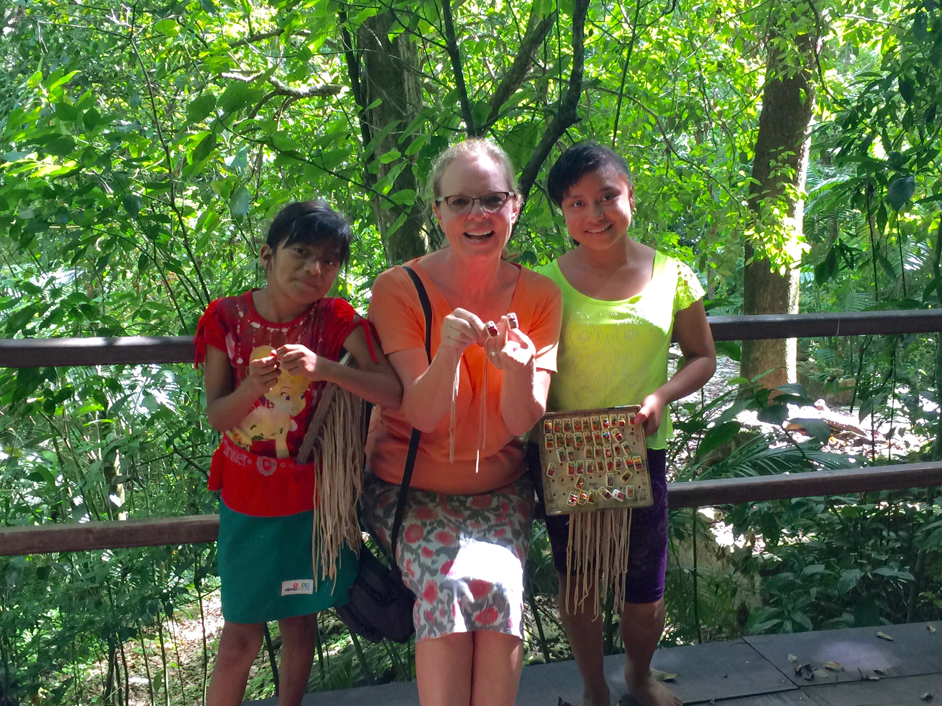 As we descended the steps from the ruins two little girls called to Michael, “Senor, mira cascada” (sir, see the water falls). Mike fell for it and went to see what they wanted to show him. It was a ploy to get us to stop and look at the trinkets they planned to sell us. There are people selling souvenirs all over the area and we must have said, “no, gracias” 500 times as vendors approached us but Mike is a pushover with kids and we now own Mayan calendar necklaces