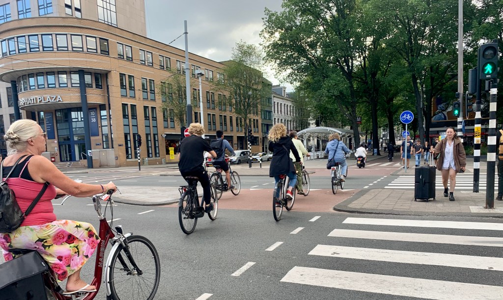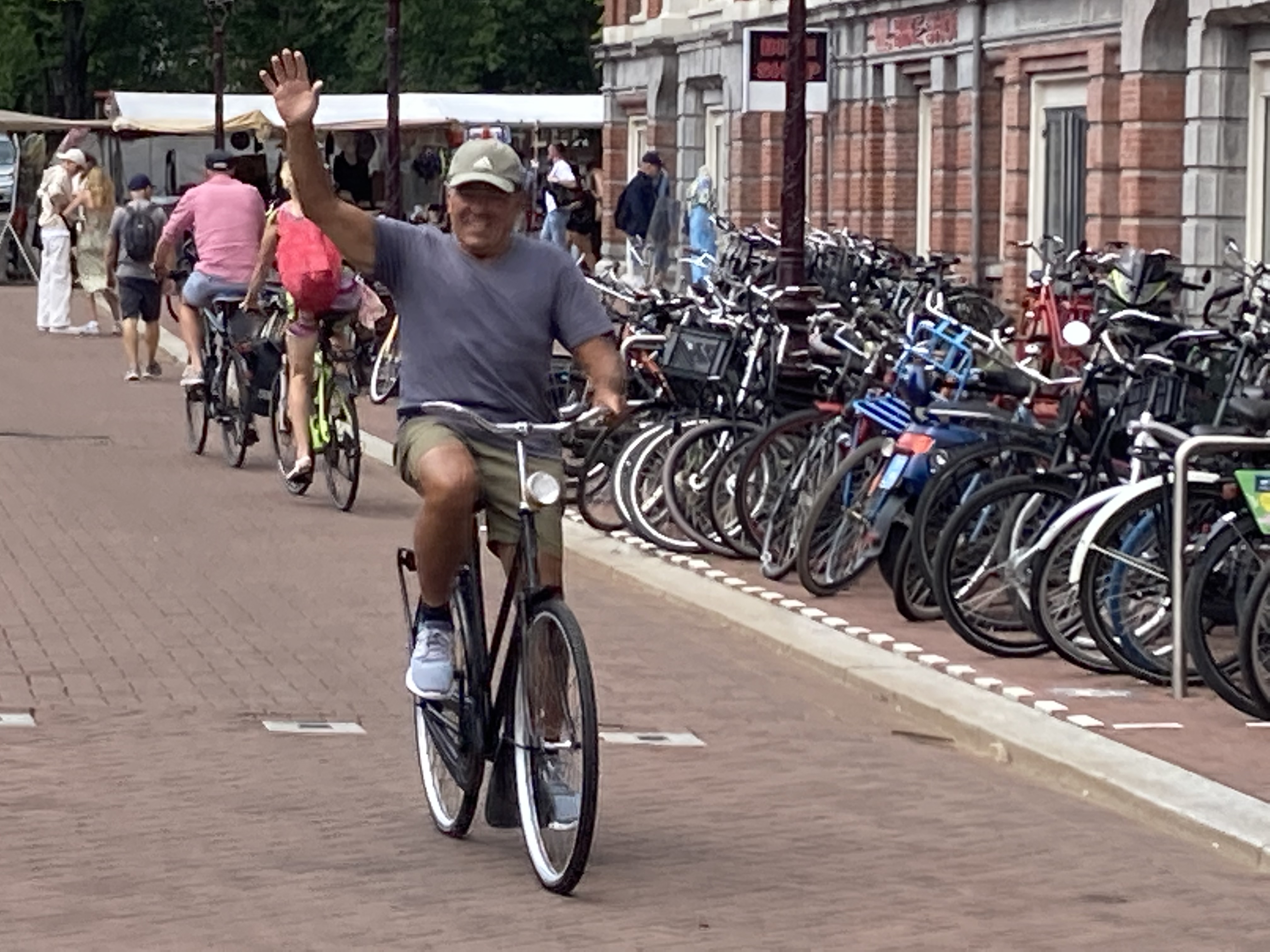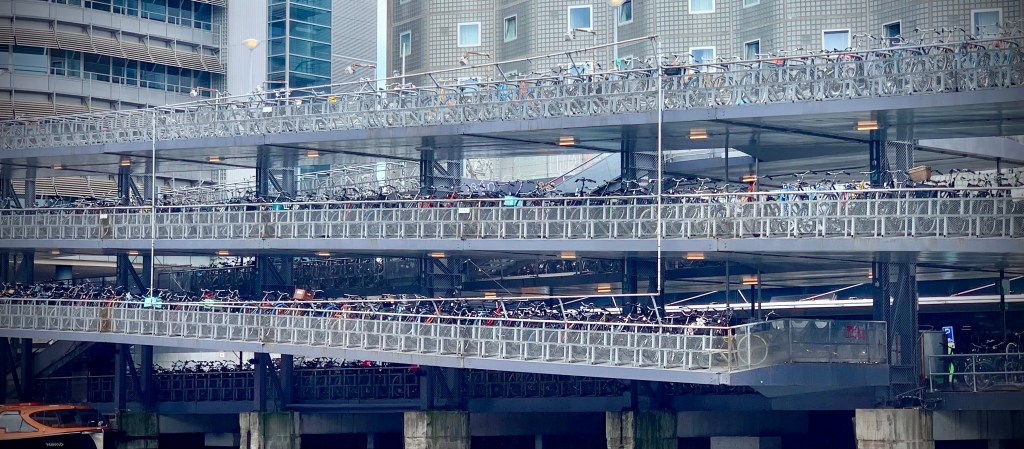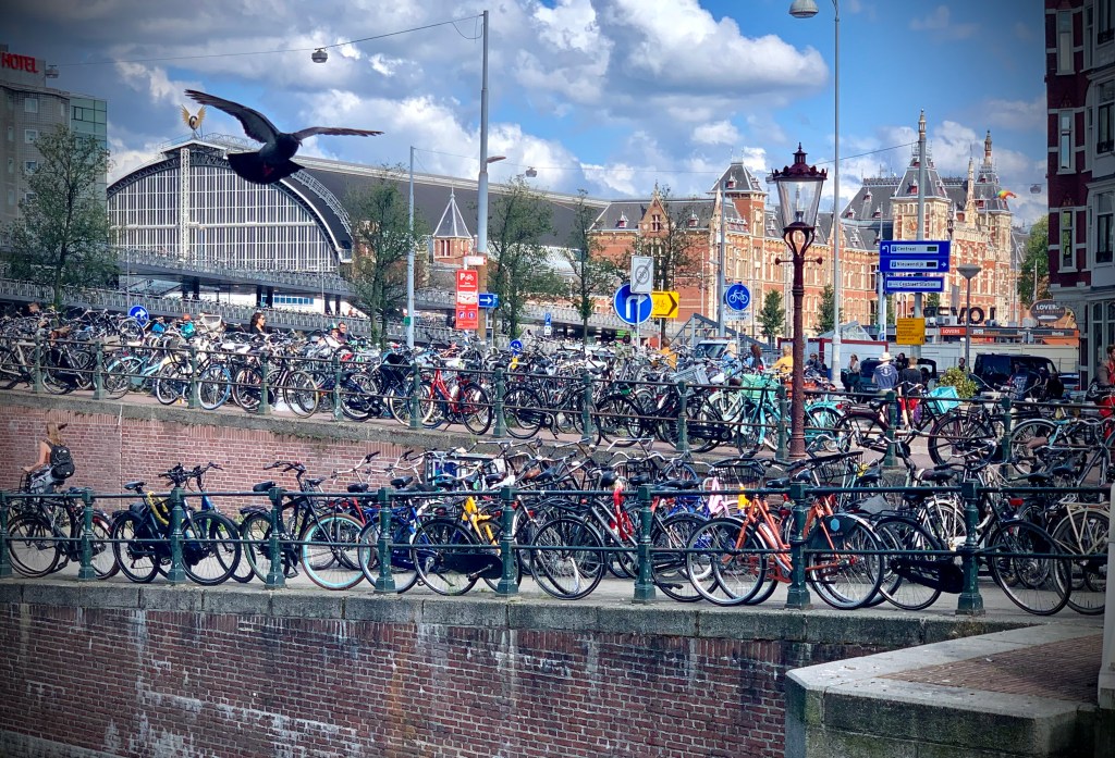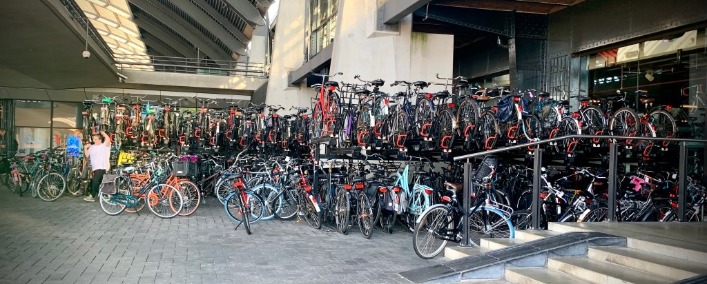 One of the first things that struck us in Amsterdam is all of the bikes! There are so many bike riders on the street. Every street is lined on both sides with bike paths that are typically adjacent to the sidewalks. And if we were amazed by the number of bicycles on the street, we were dumbstruck by the bike parking. There was jammed full bike parking everywhere from the racks in front of our hotel to the huge bike garage at the train station. Of course Mike had to get into the action and try a local style bike at a swap meet we came across.