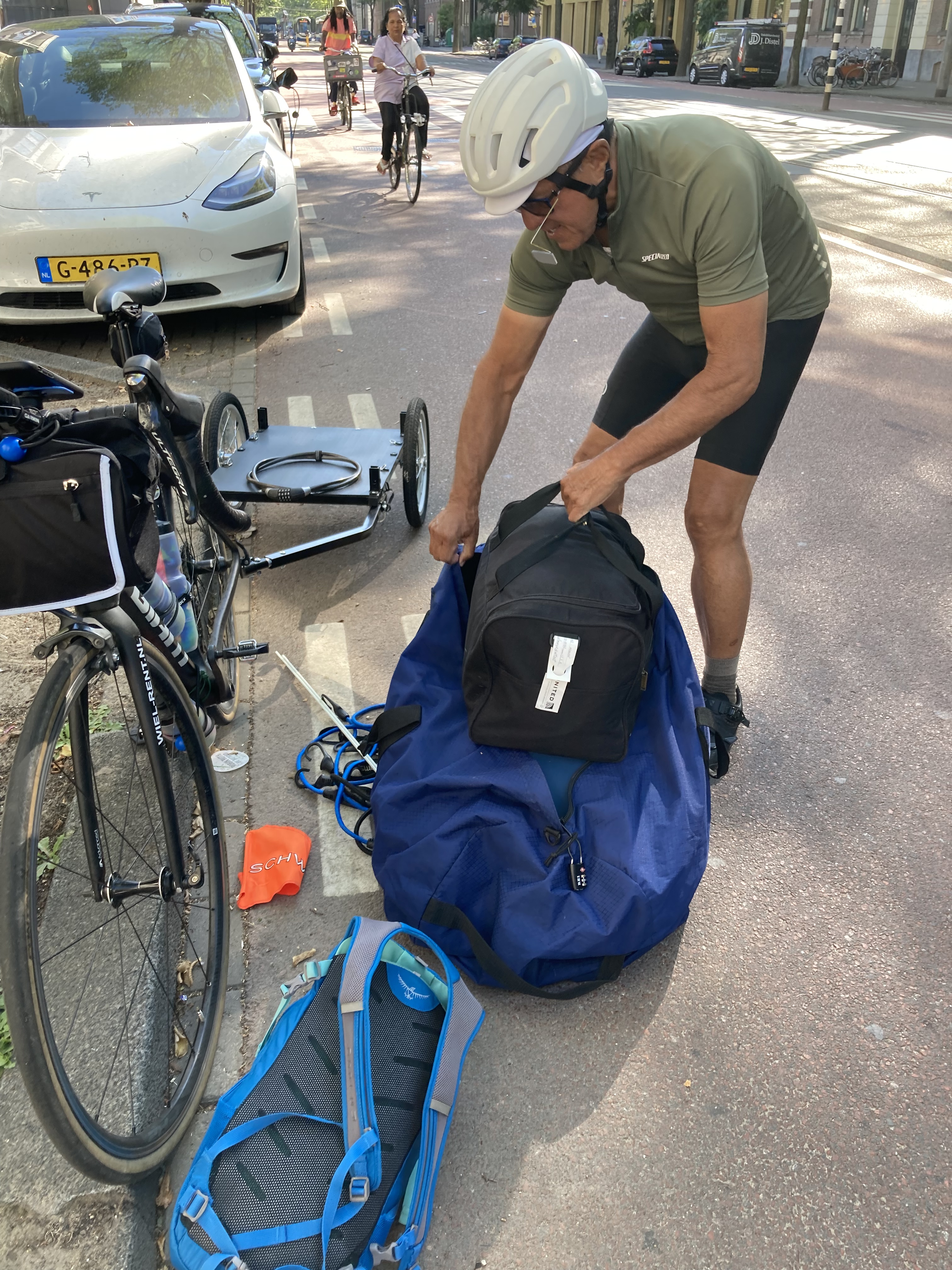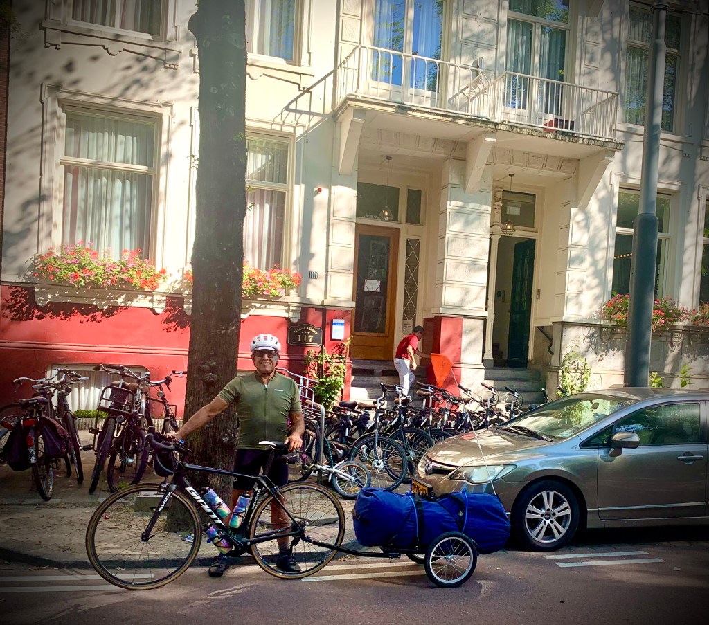 After one more night on the boat we were kicked out of the nest and on our own as we had to be off the boat by 9:00 the next morning. For the first time we had to figure out how to pack all of our belongings (why did we bring so much) onto the bike trailer. Even though we had explained our plan to travel back to Paris on our bikes to our fellow travelers during the cruise, they were all very curious about our packing plan. As Michael struggled to get everything onto the trailer, we consoled ourselves that the packing would get easier as we got more practice. Luckily our first ride was only a few miles through Amsterdam to our hotel.