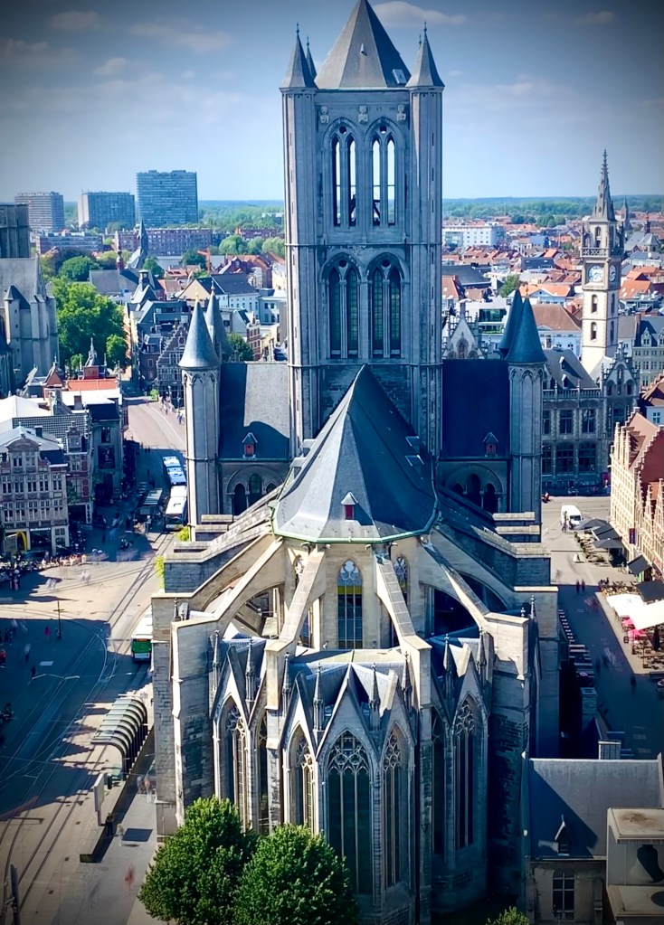 We went to the top of the Belfry of Ghent for a view of the whole town. Besides religious purposes belfries (towers with big bells in them) played an important role in medieval towns and Ghent’s belfry was one of the earliest built from 1313-1380. Medieval towns were quite chaotic and one of the reasons was that there was no ability to keep time. Beginning in 1378 hourly bells rang out marking the hour to help regulate daily life. Ghent was one of the first towns to use their belfry in this manner and soon it was a requirement that all towns have a belfry to keep time. We saw belfries in many towns but Ghent’s was the only one we went to the top of because it had an elevator.