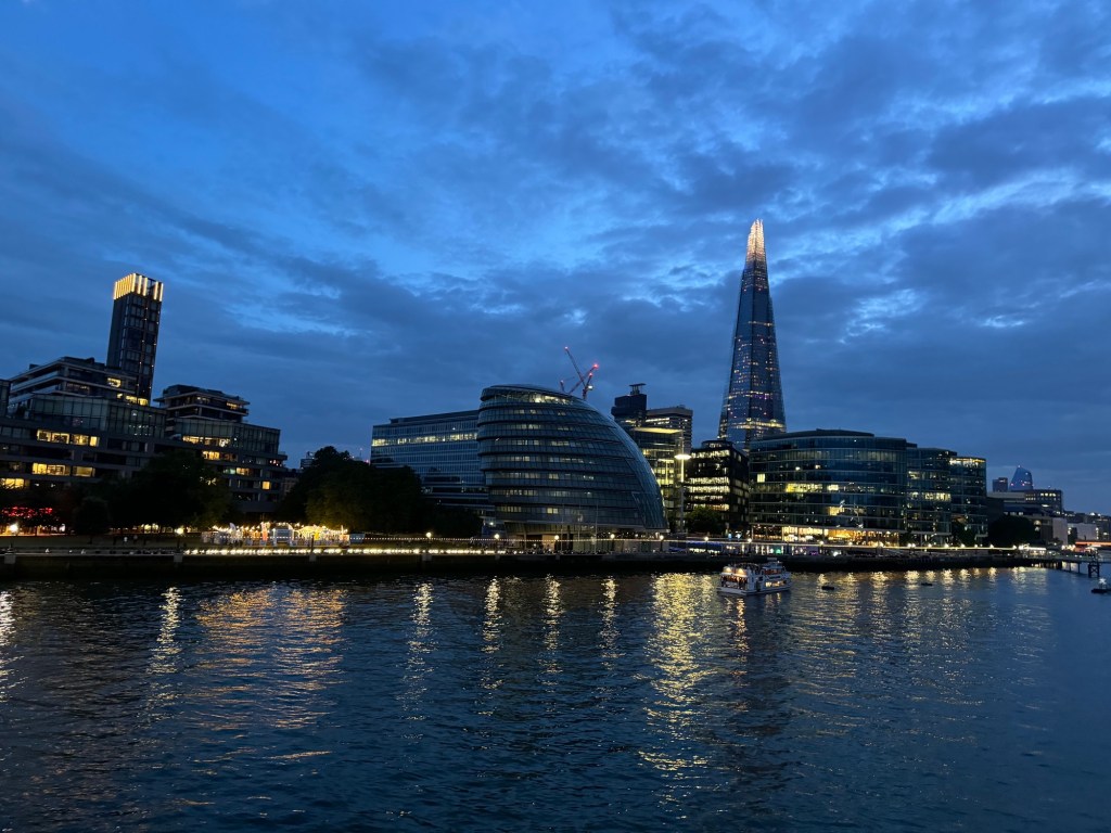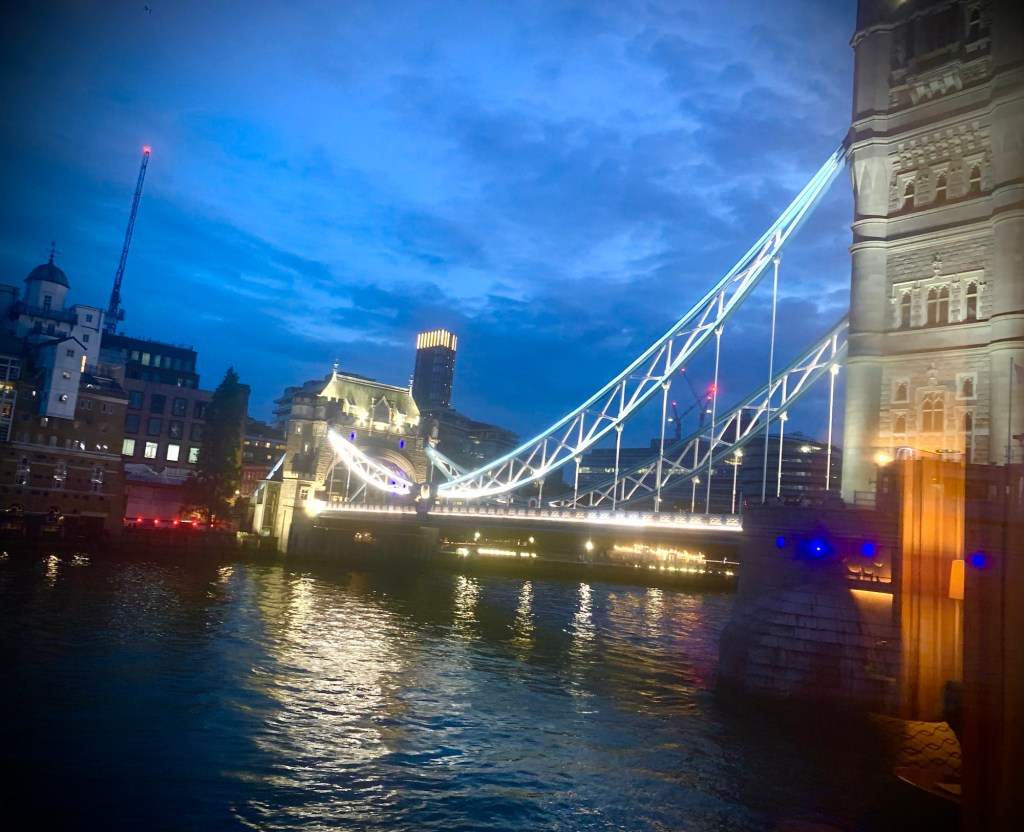 We sailed up the Thames River into London in the evening. The river was busy with boats of all sizes and there was much waving and helloing from boat to boat. As the evening got darker, the lights of the city were beautiful.
